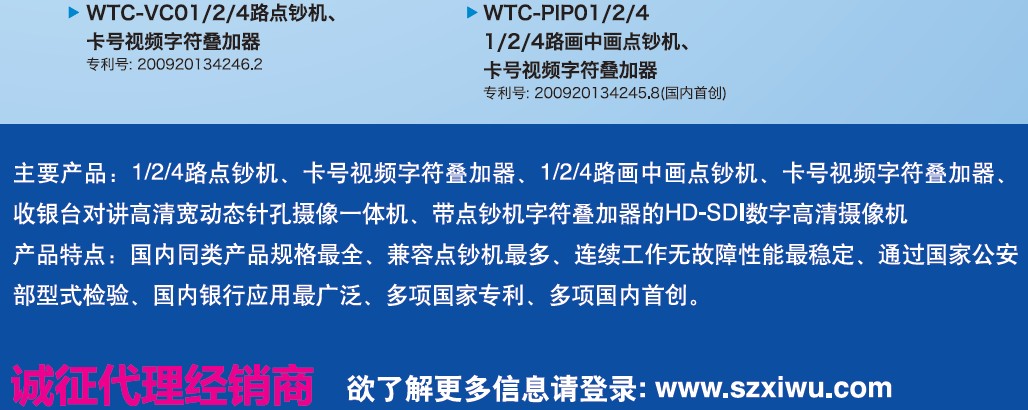 自主研發產品:點鈔機視頻字符疊加器、畫中畫點鈔機字符疊加器、銀行卡號字符疊加器、畫中畫銀行卡號字符疊加器、銀行窗口攝像對講一體機系統、針孔攝像對講機、700線單板機、電梯樓層顯示器(電梯樓層字符疊加器)等應用于銀行網點及其他繳費場所的監控設備。
